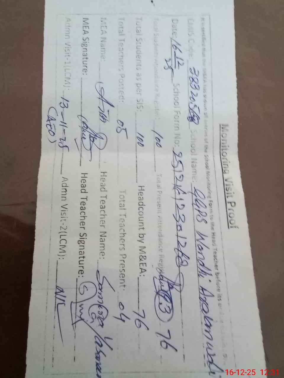 | Attendance Register | Head Teacher | MEA with School | Visit Proof |