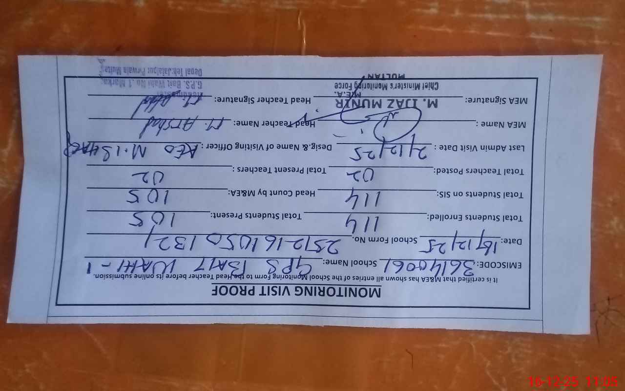 | EMIS Code: 36140061 | Name of School: GPS BAIT WAHI NO.1 | |||