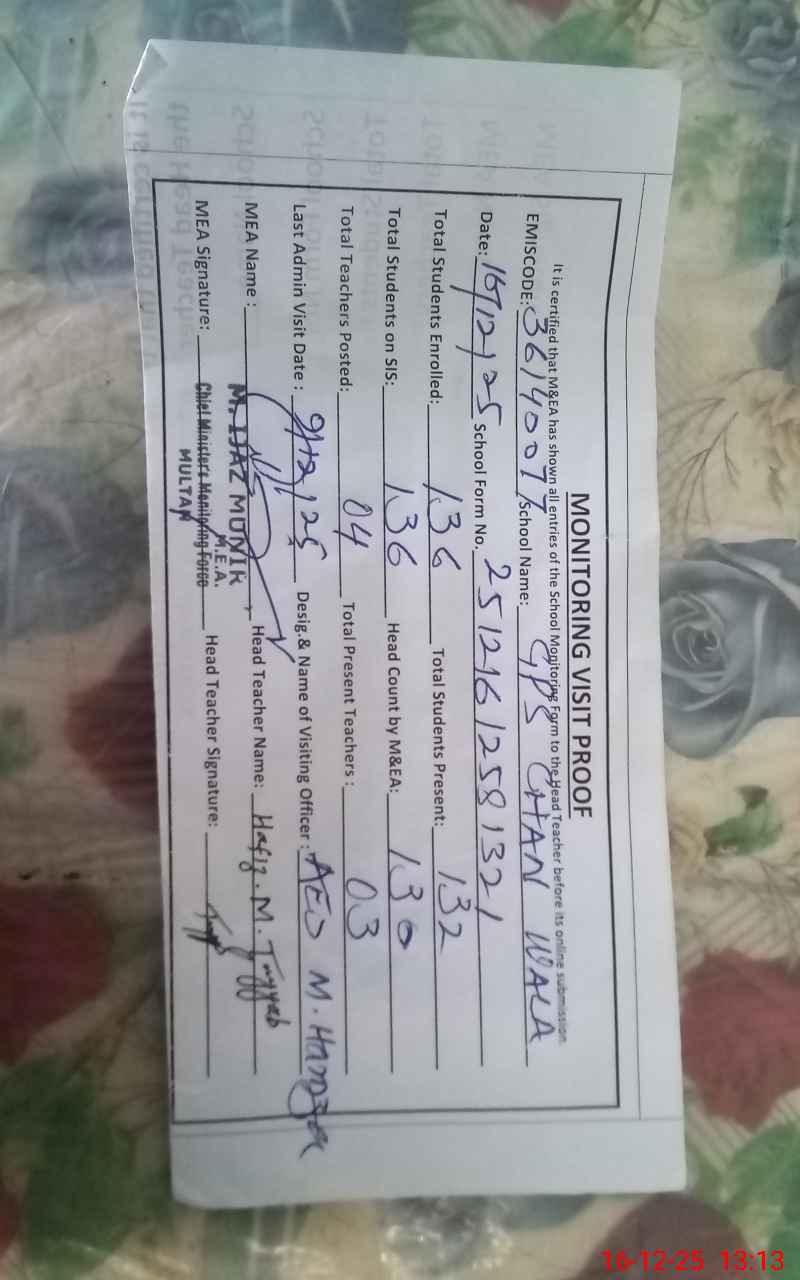 | EMIS Code: 36140077 | Name of School: GPS CHAN WALA JALAL PUR PIRWALA | |||