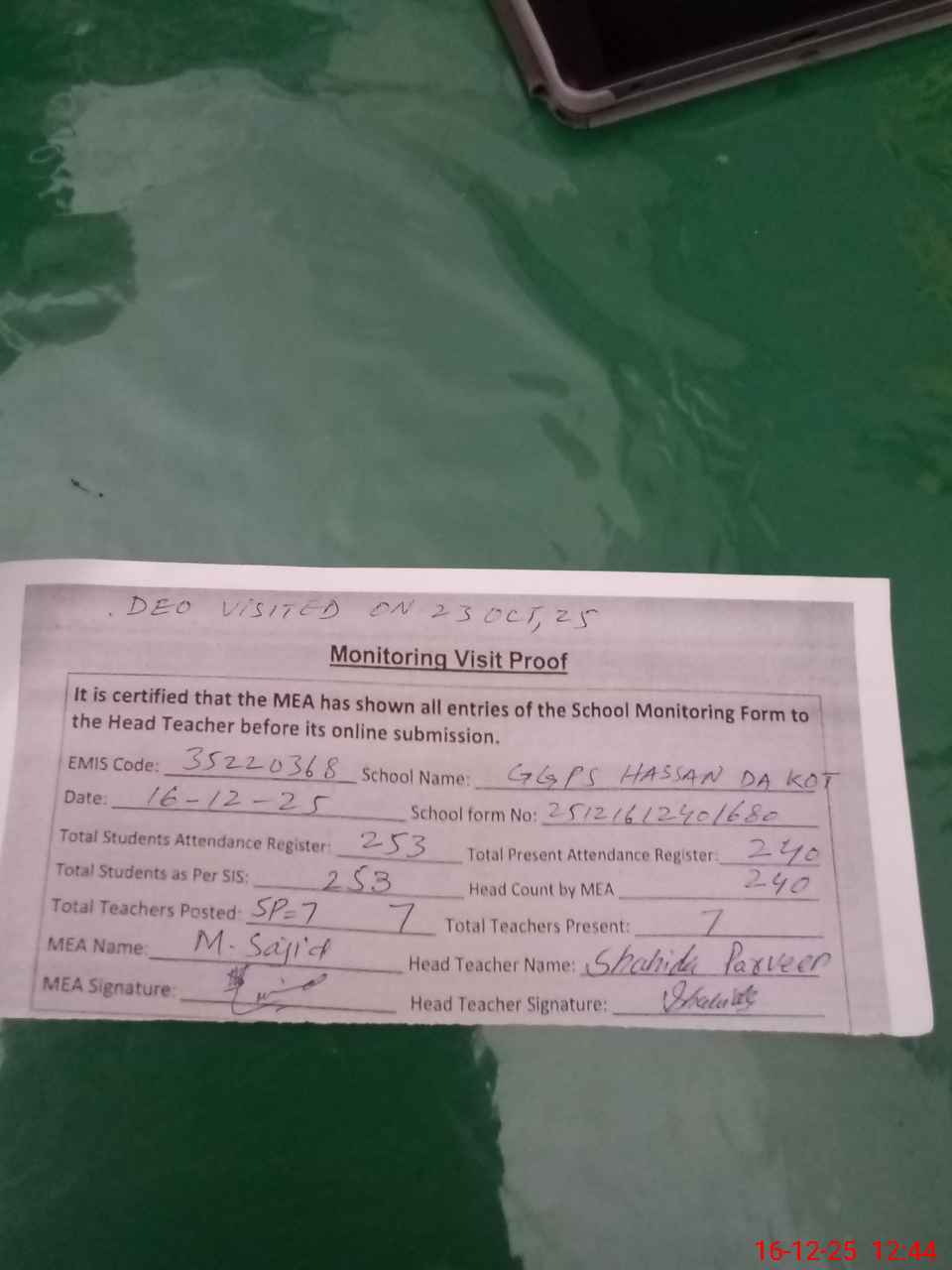 | Certified that this School was Inspected by the Undersigned MEA/DMO Today and the Information Stated Above is as Per Record. | |||||