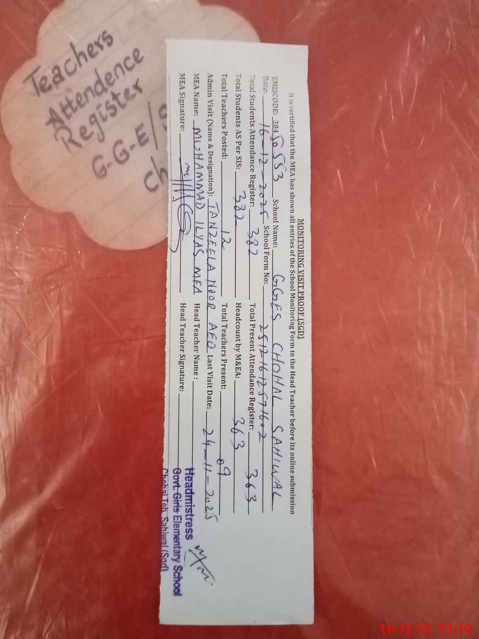 | Attendance Register | Head Teacher | MEA with School | Visit Proof |