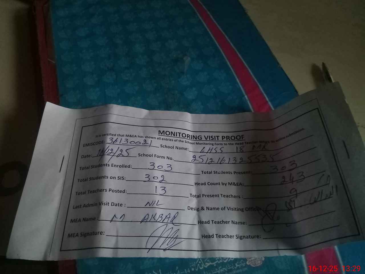 | EMIS Code: 36130021 | Name of School: GHSS 18/MR DUNYA PUR ROAD | |||