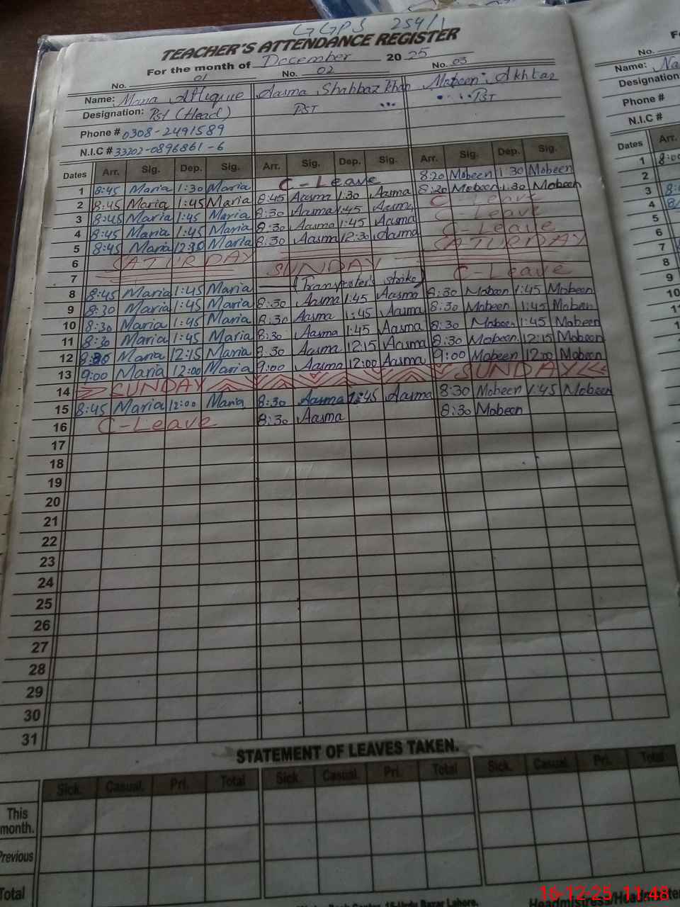 | CNIC | Full Name | Designation | R/C | Absence During Last Calender Month |