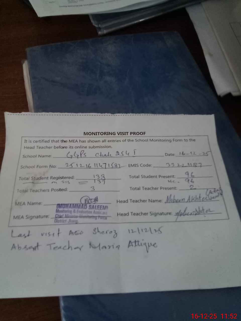 | Attendance Register | Head Teacher | MEA with School | Visit Proof |