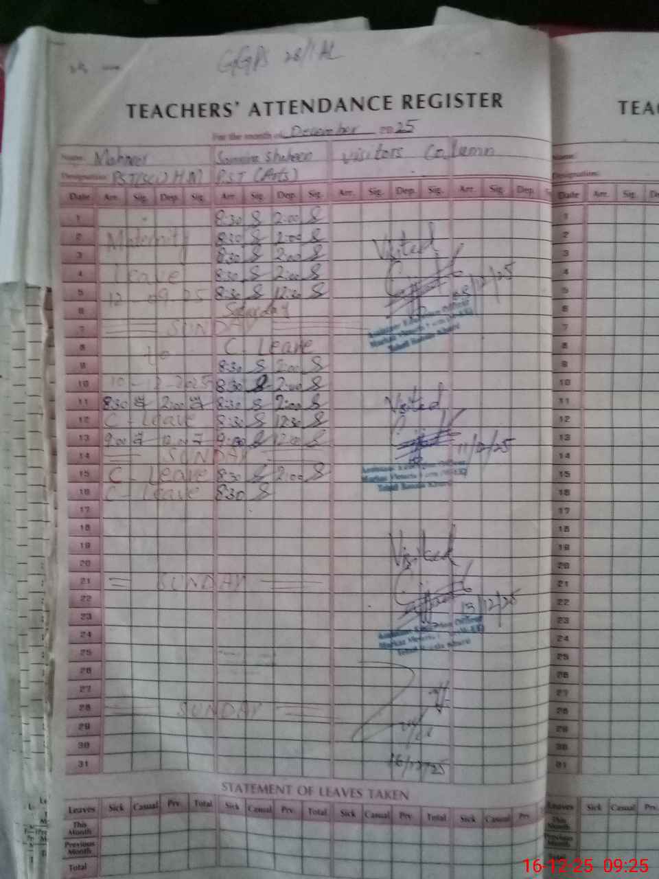 | Leave | Duty | Absent | Maternity | Medical | Ex- Pak |