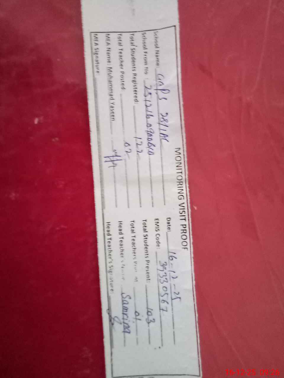 | Attendance Register | Head Teacher | MEA with School | Visit Proof |