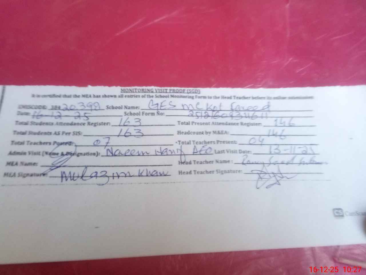| Attendance Register | Head Teacher | MEA with School | Visit Proof |