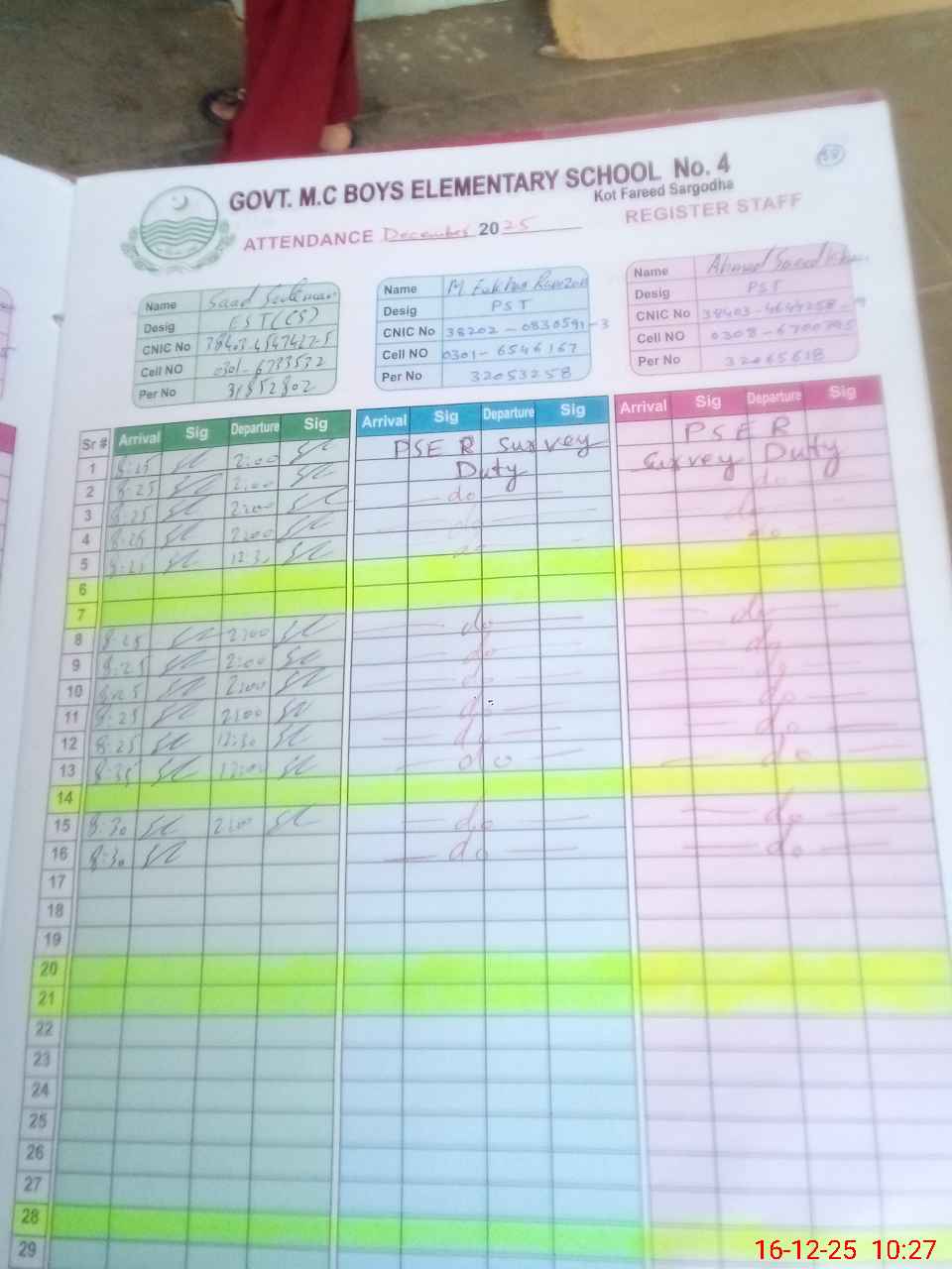 | CNIC | Full Name | Designation | R/C | Absence during last cal. month |