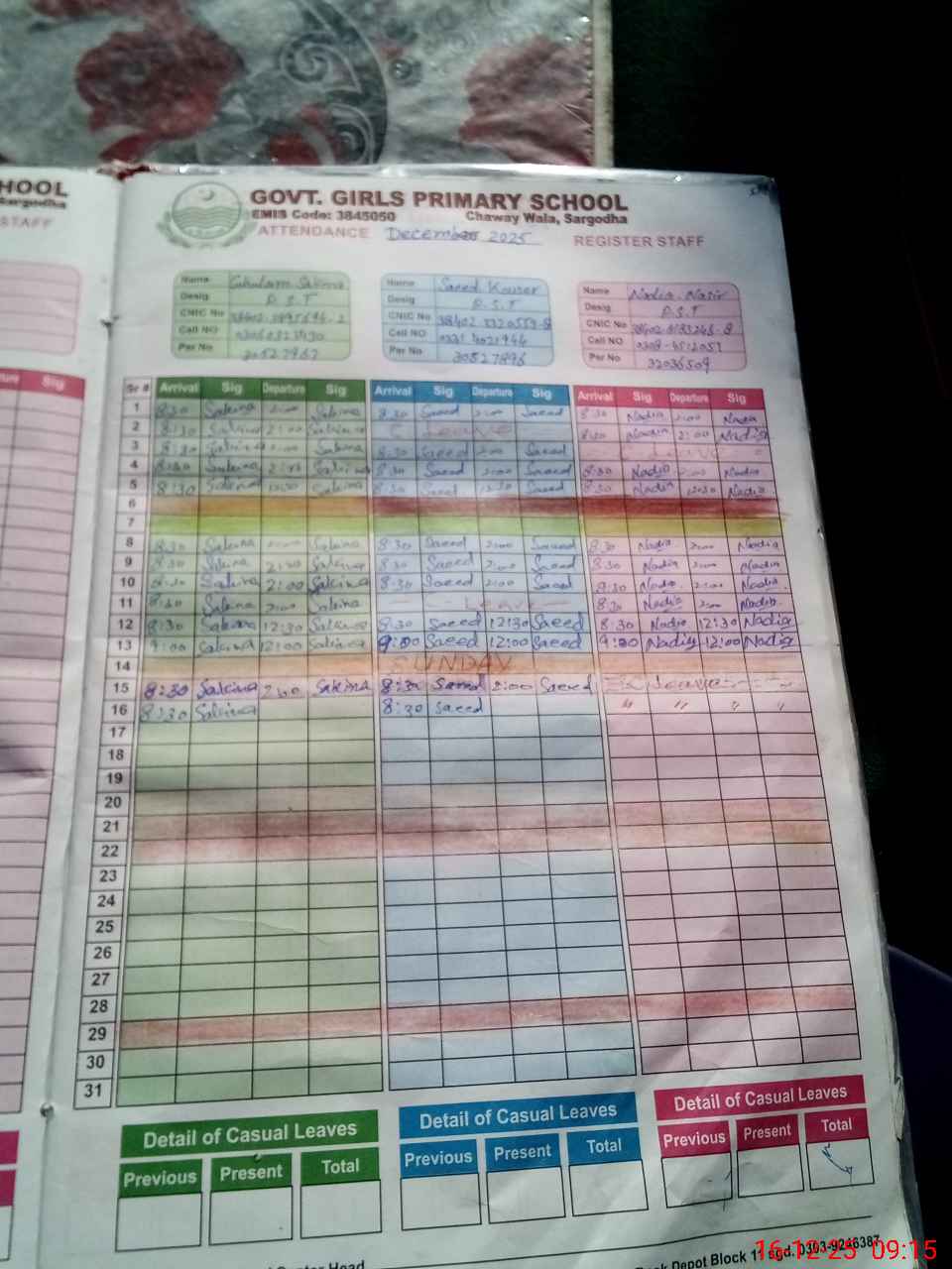 | CNIC | Full Name | Designation | R/C | Absence During Last Calender Month |