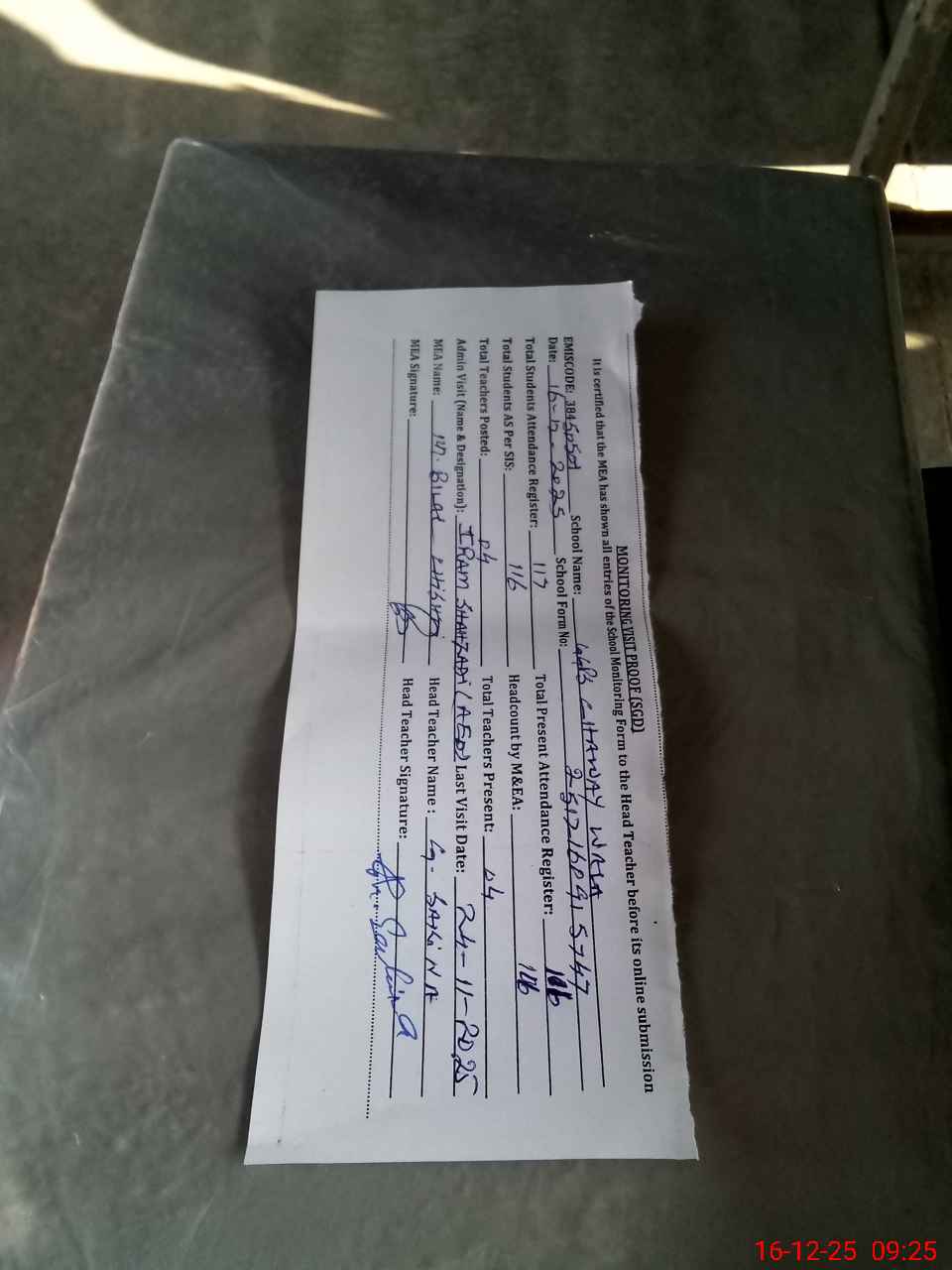 | Attendance Register | Head Teacher | MEA with School | Visit Proof |