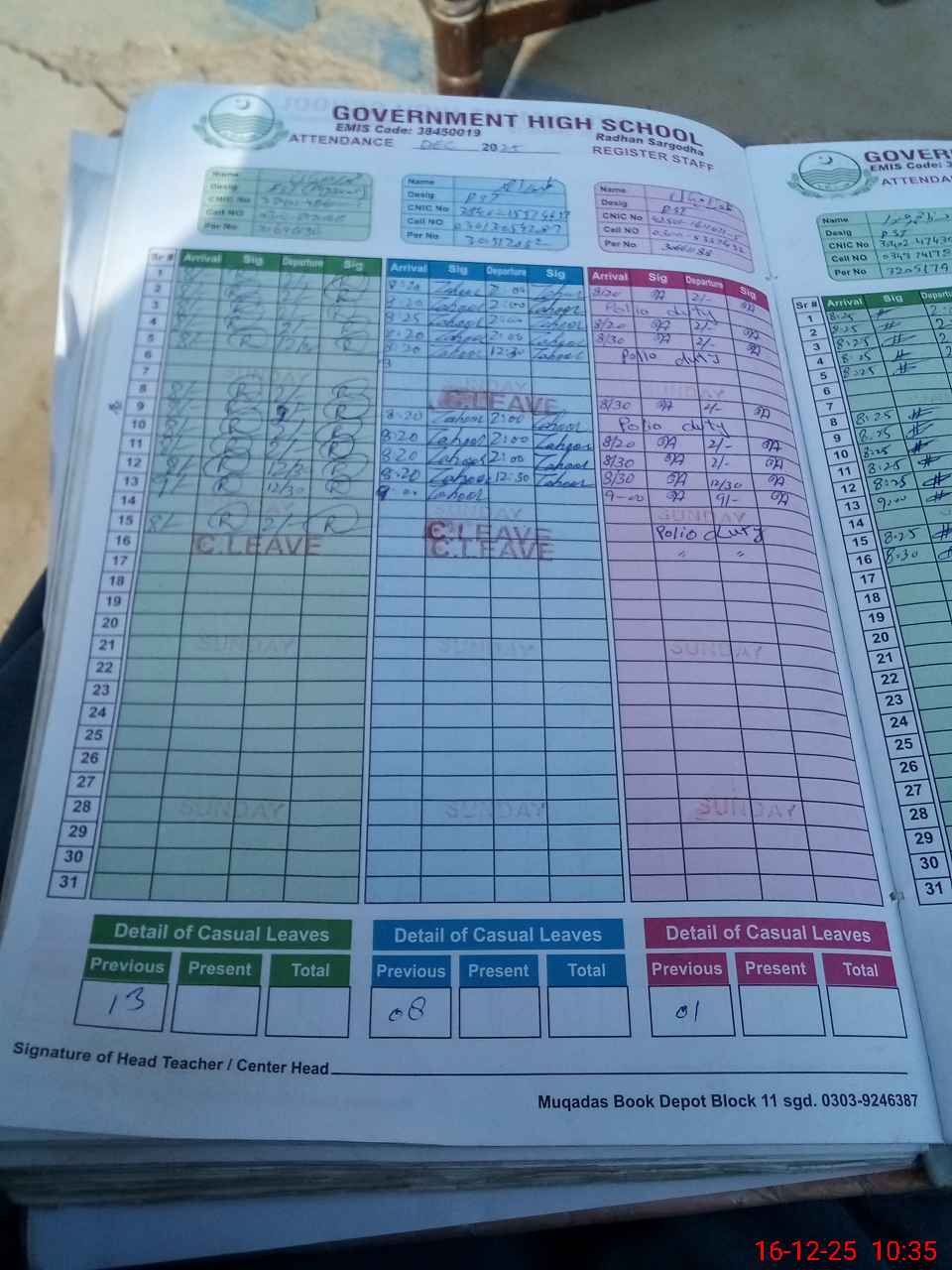 | CNIC | Full Name | Designation | R/C | Absence During Last Calender Month |