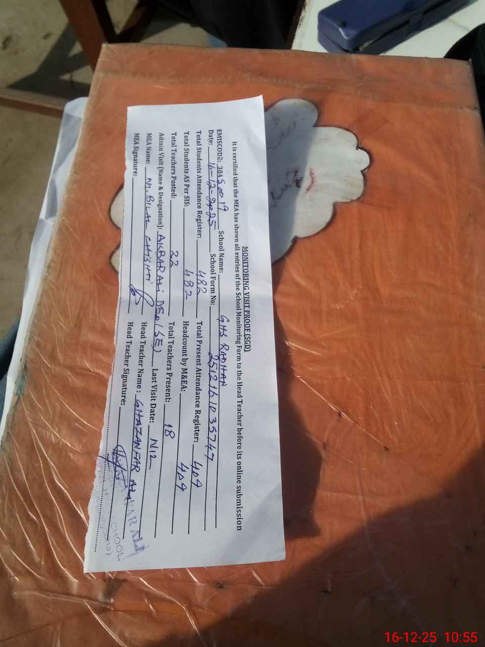 | Attendance Register | Head Teacher | MEA with School | Visit Proof |