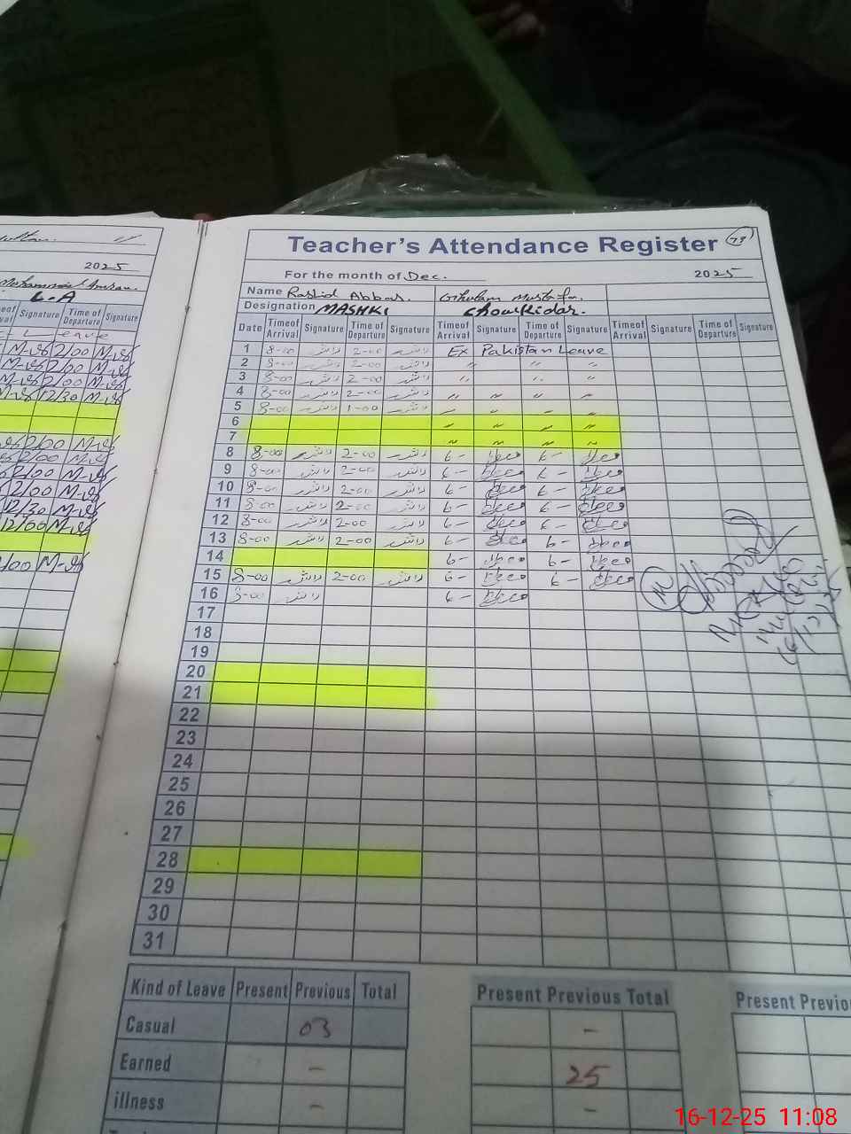 | CNIC | Full Name | Designation | R/C | Absence During Last Calender Month |