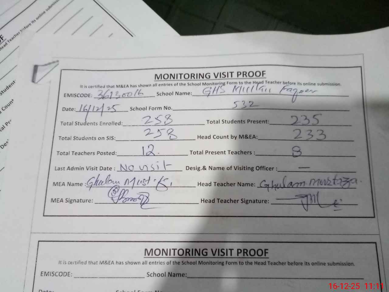 | Attendance Register | Head Teacher | MEA with School | Visit Proof |