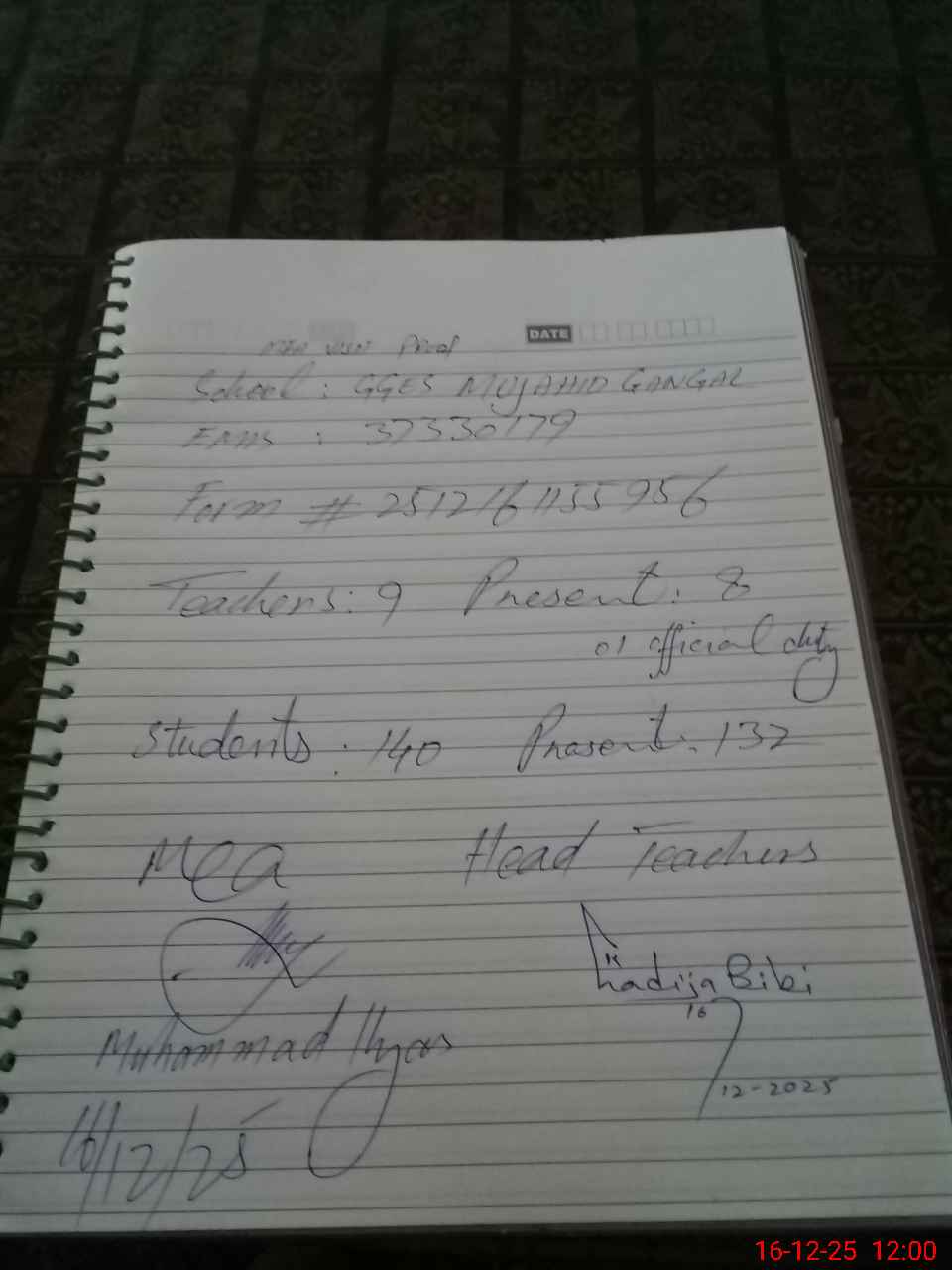 | Attendance Register | Head Teacher | MEA with School | Visit Proof |