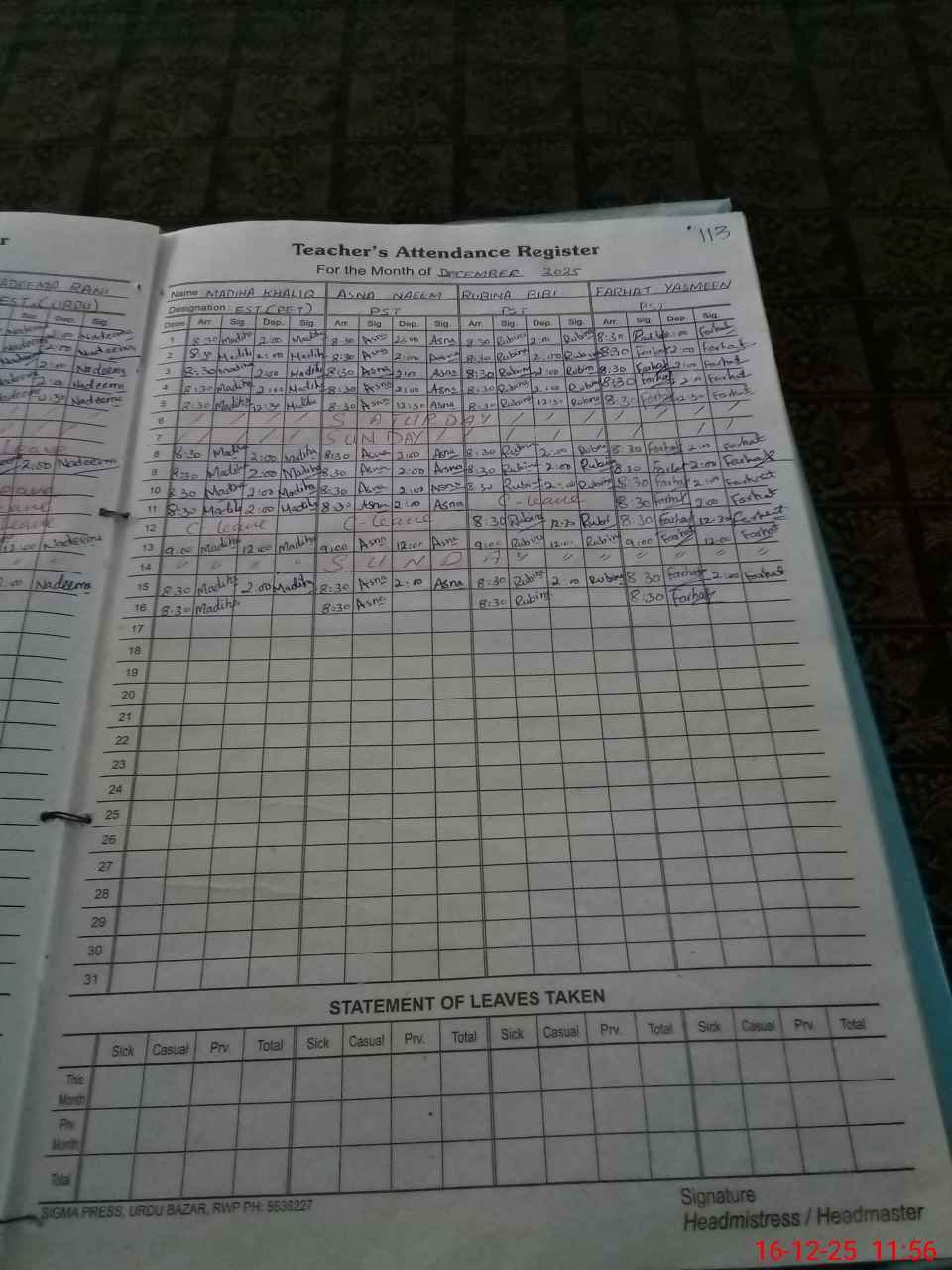 | CNIC | Full Name | Designation | R/C | Absence During Last Calender Month |