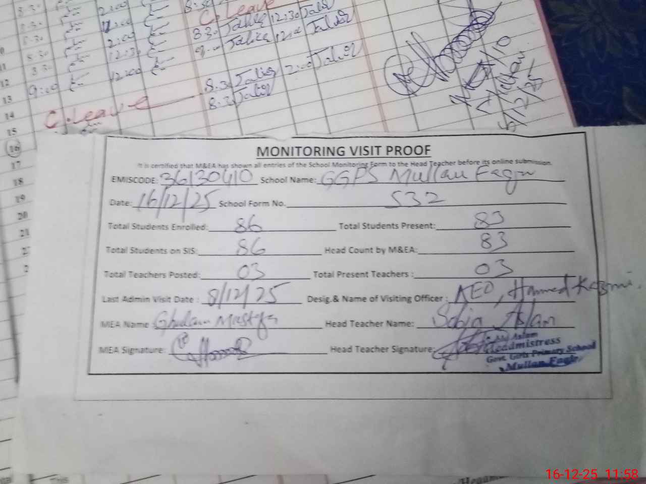 | Attendance Register | Head Teacher | MEA with School | Visit Proof |