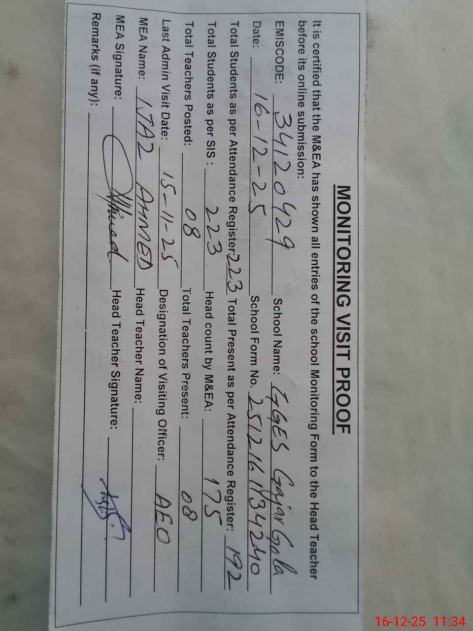 | Attendance Register | Head Teacher | MEA with School | Visit Proof |