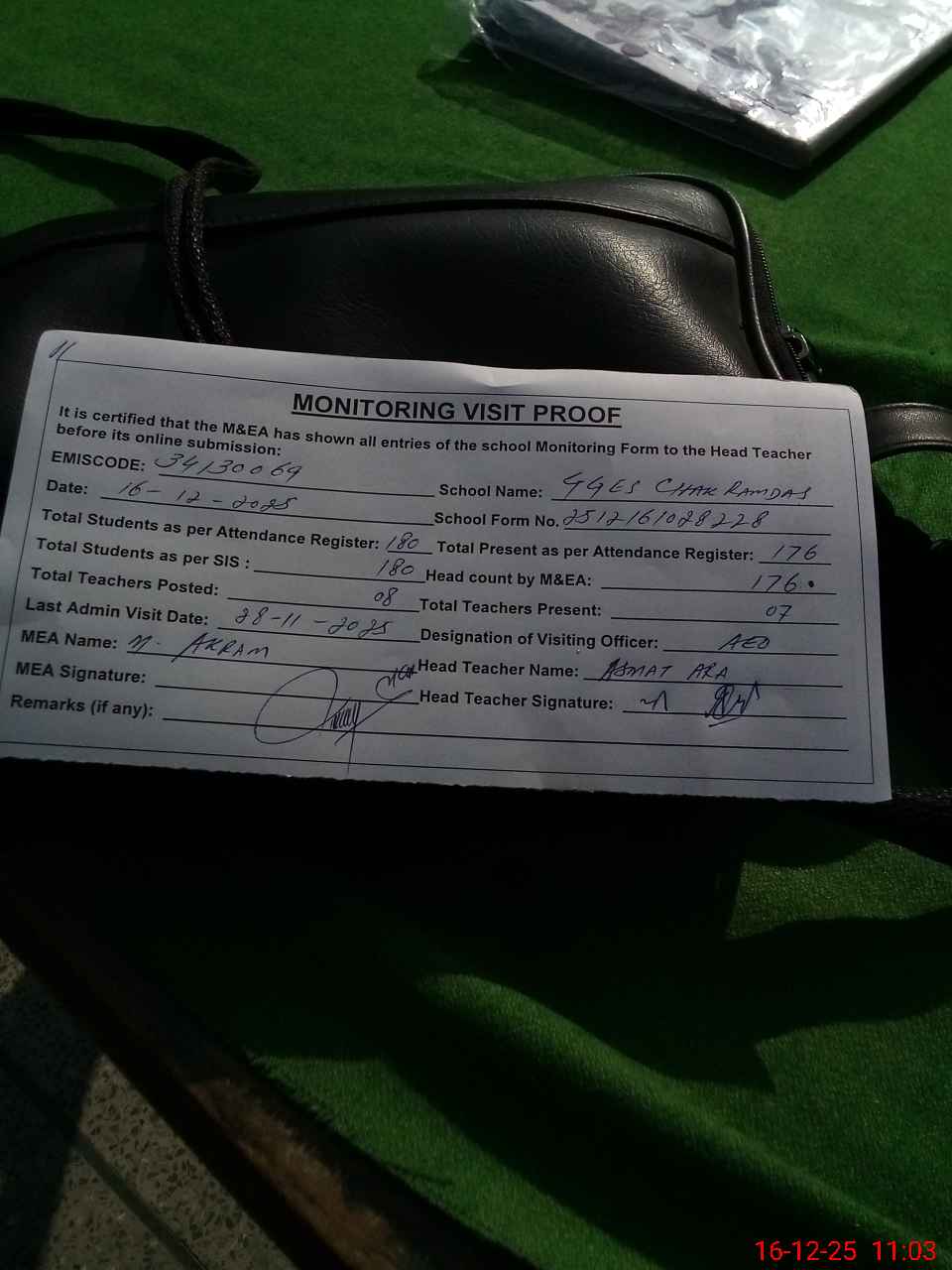 | Attendance Register | Head Teacher | MEA with School | Visit Proof |