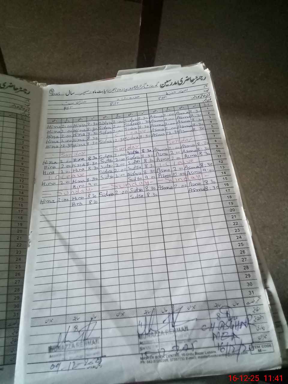 | CNIC | Full Name | Designation | R/C | Absence During Last Calender Month |