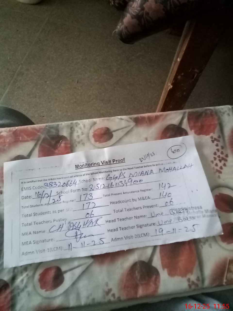 | Attendance Register | Head Teacher | MEA with School | Visit Proof |