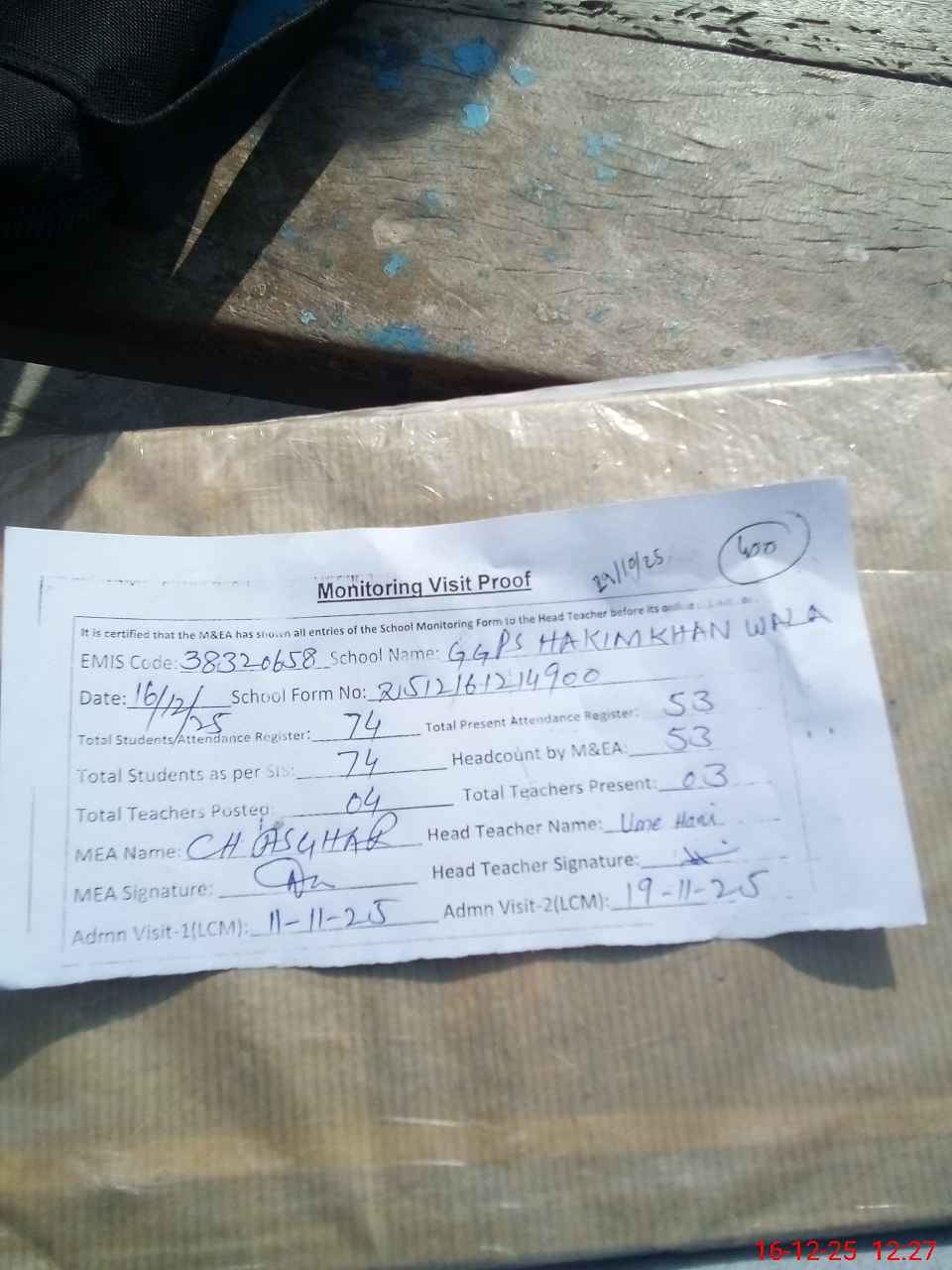 | EMIS Code: 38320658 | Name of School: GGPS HAKIM KHAN WALA | |||