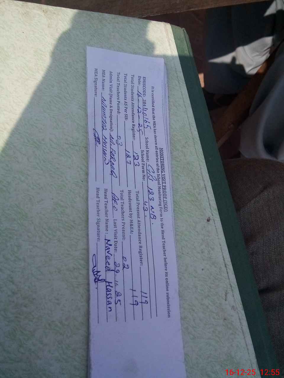 | Attendance Register | Head Teacher | MEA with School | Visit Proof |