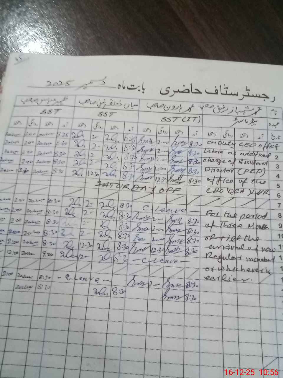 | CNIC | Full Name | Designation | R/C | Absence during last cal. month |