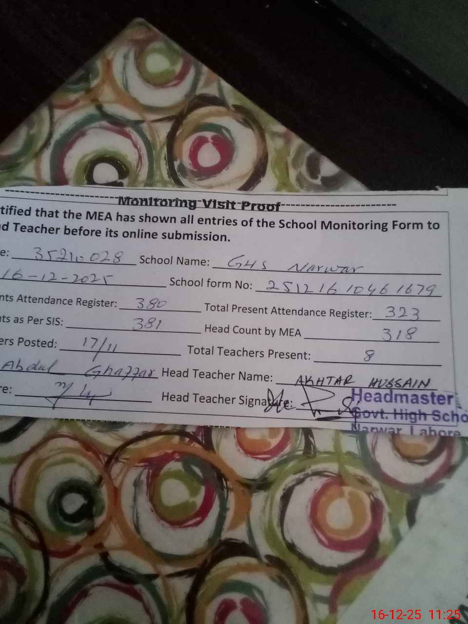 | Remarks (Use Separate Page if Required): Headmaster Muhammad shehbaz Rafiq attached CEO office since 8 April 2025 but teacher strength already very low only 11 teachers are transferred out of 17 NSB and FTF BANK statement not avaiable 2 wash rooms found non functional 2 class rooms found under construction Cracks found on wall of 01 class room and class conducting there maintenance required of boundary wall | |||||