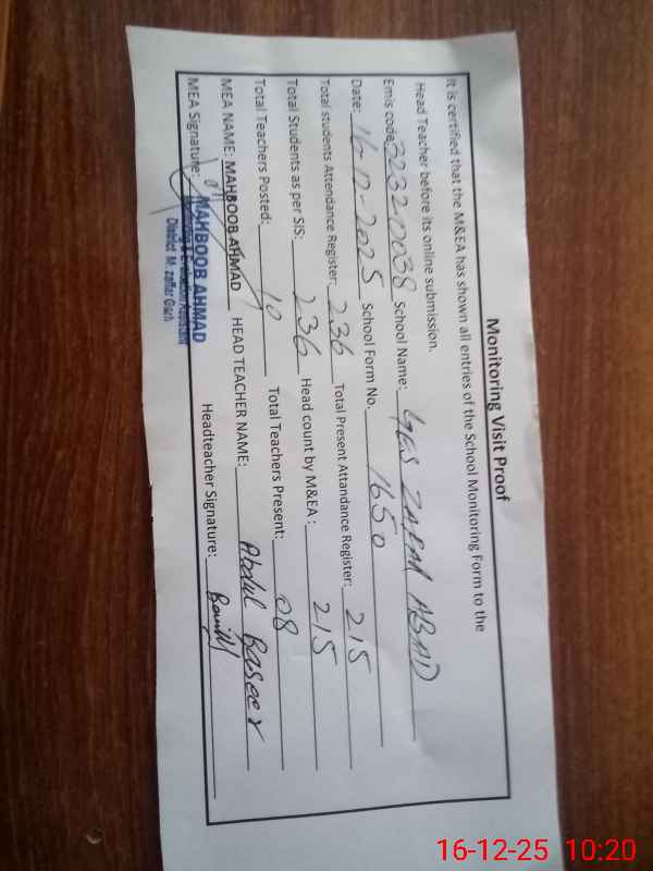 | EMIS Code: 32320038 | Name of School: GES ZAFAR ABAD | |||