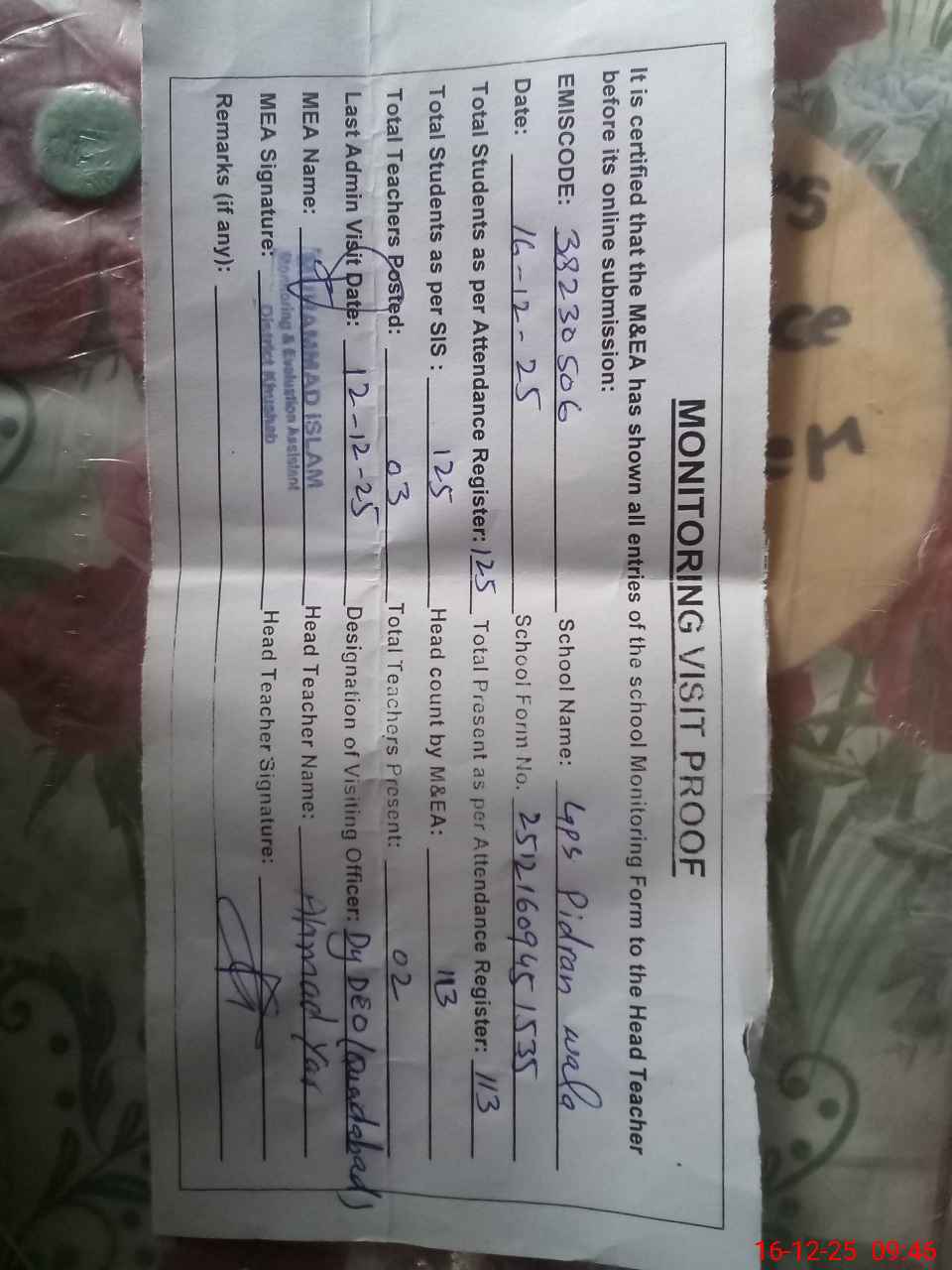 | Remarks (Use Separate Page if Required): Dy DEO visited school on 12 December 2025 Students strength on sis 125 | |||||