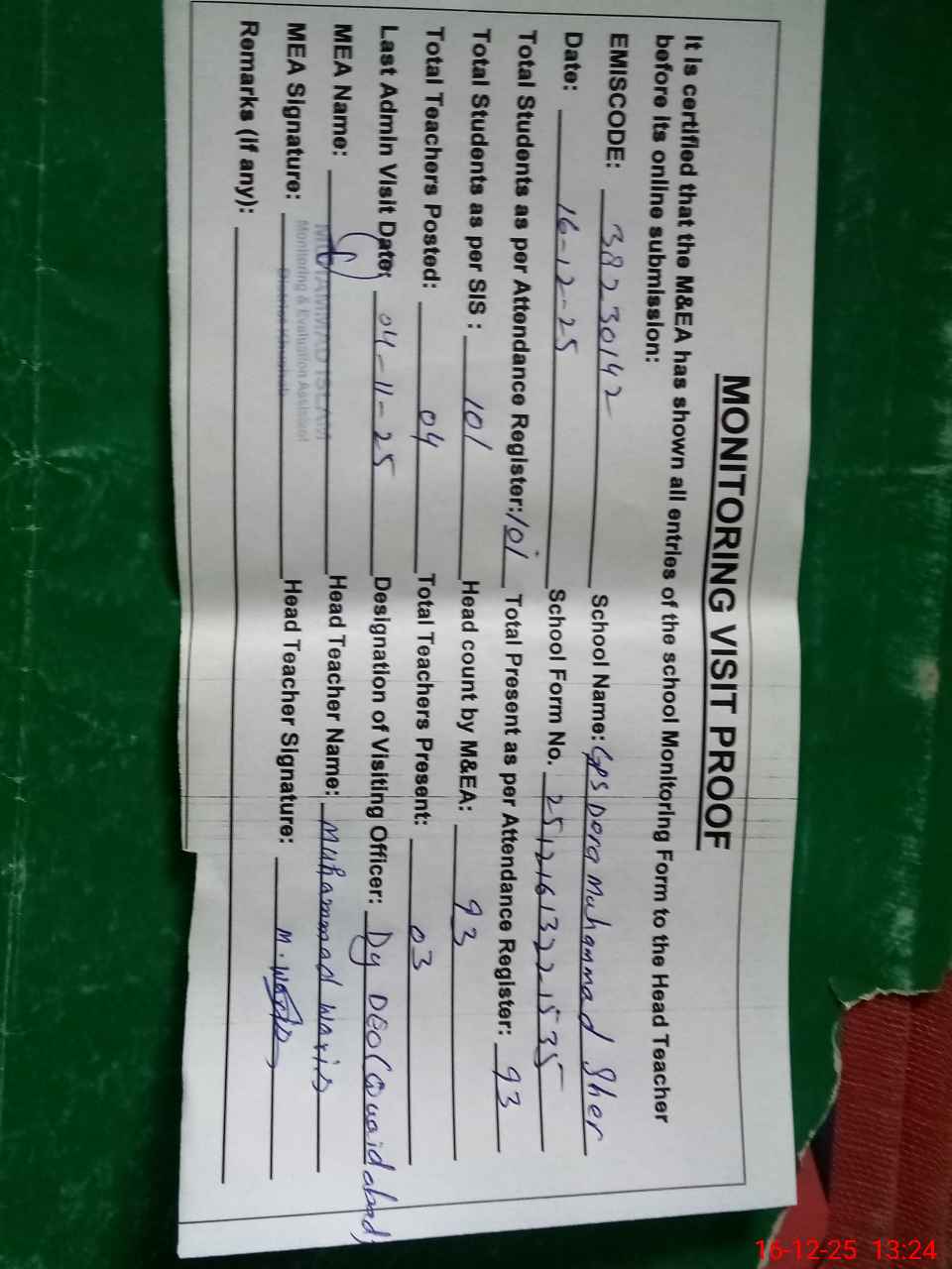 | Remarks (Use Separate Page if Required): Dy DEO visited school on 4 November 2025 students strength on sis 101 | |||||