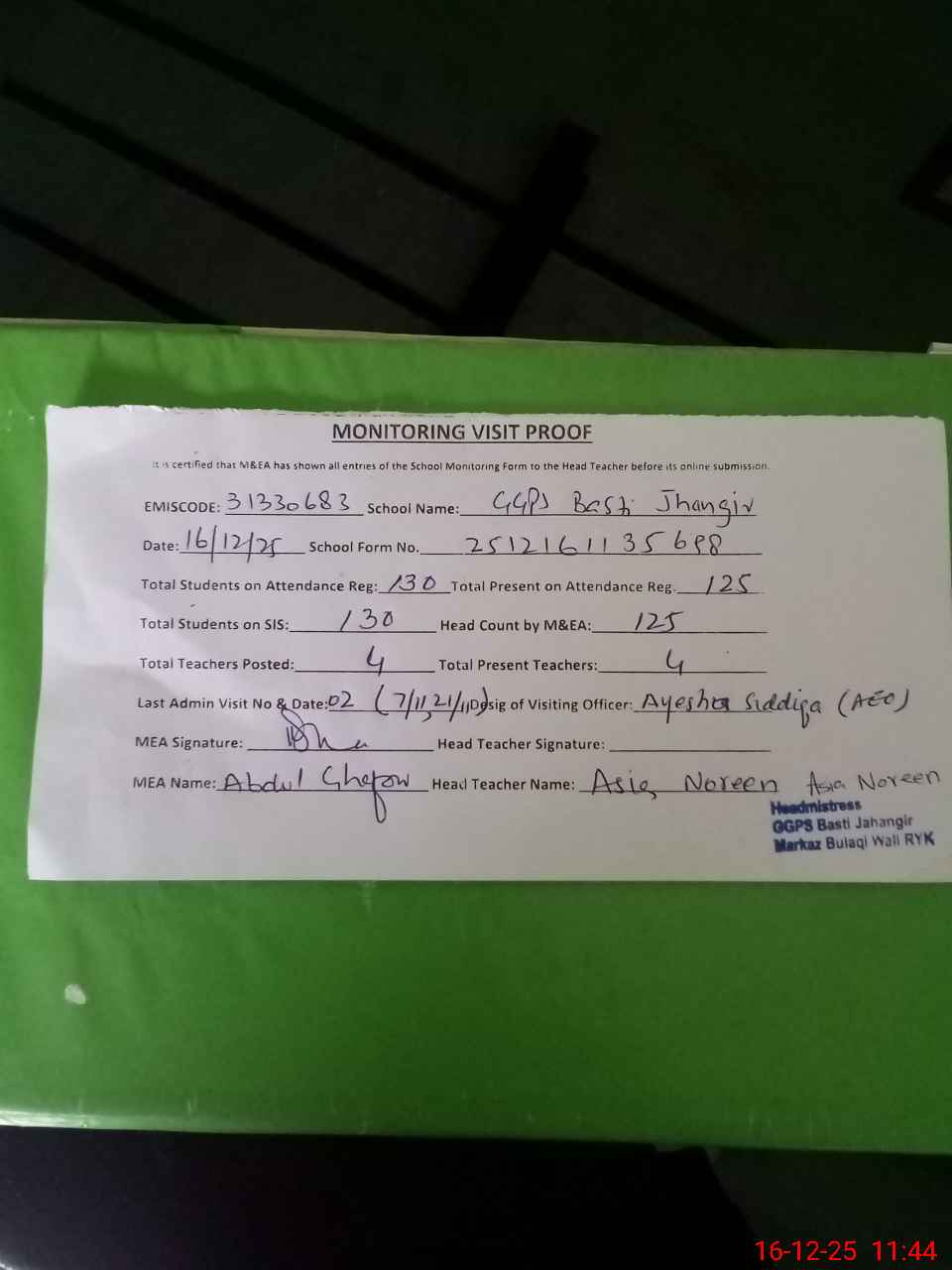 | Attendance Register | Head Teacher | MEA with School | Visit Proof |