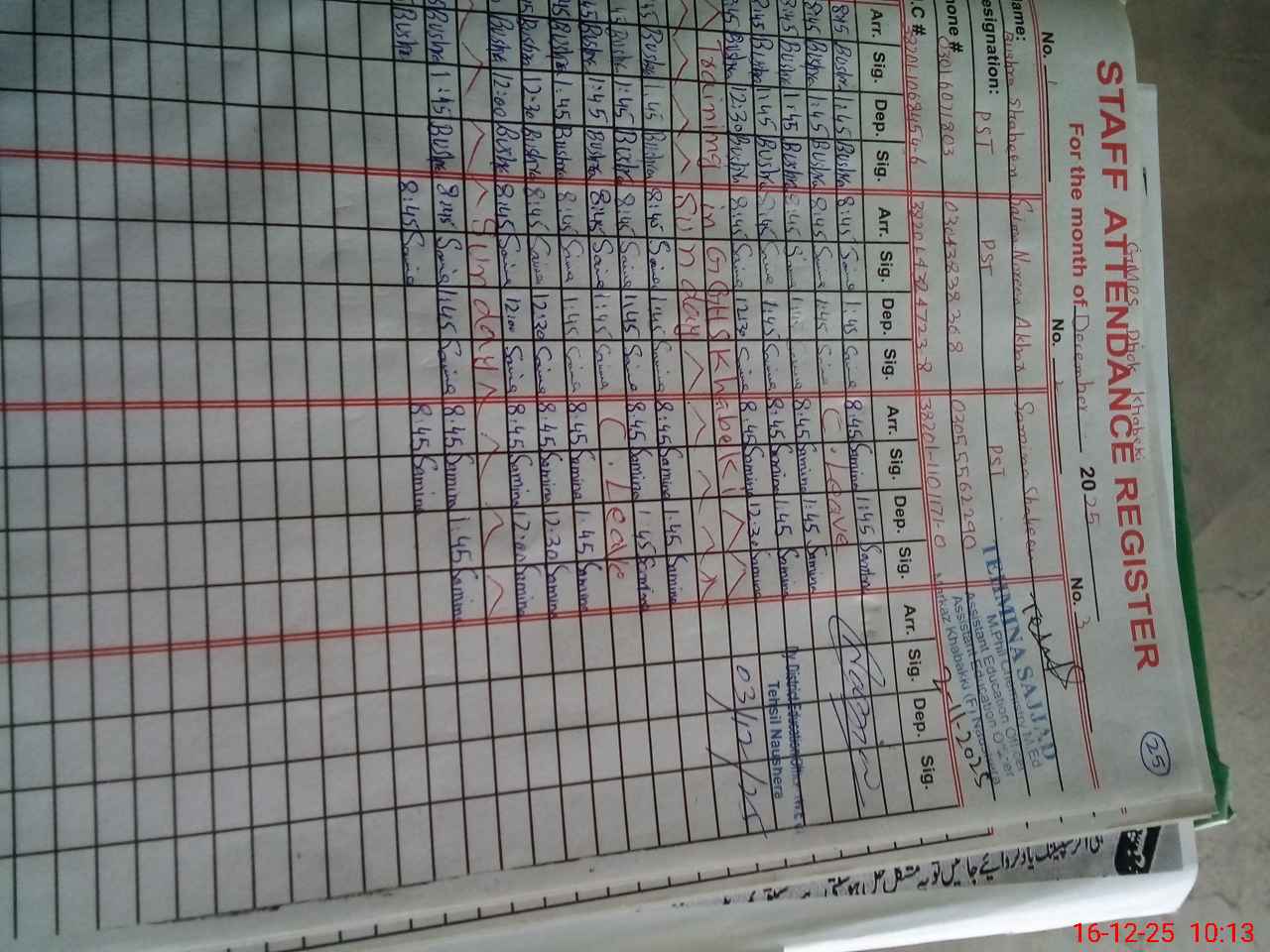 | CNIC | Full Name | Designation | R/C | Absence During Last Calender Month |