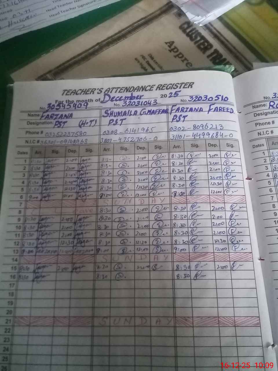 | CNIC | Full Name | Designation | R/C | Absence during last cal. month |