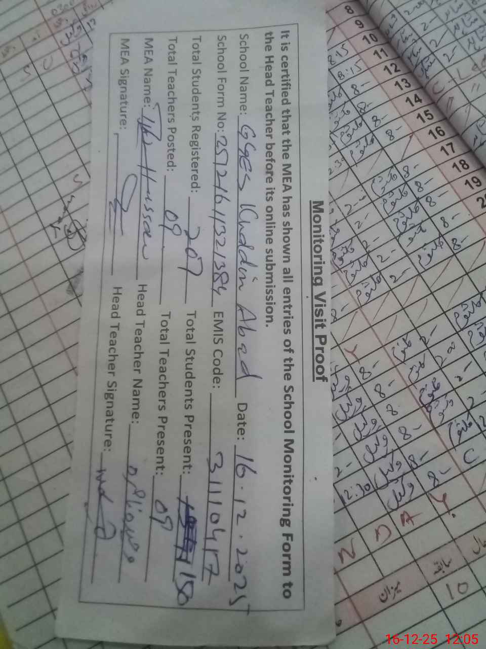 | Attendance Register | Head Teacher | MEA with School | Visit Proof |