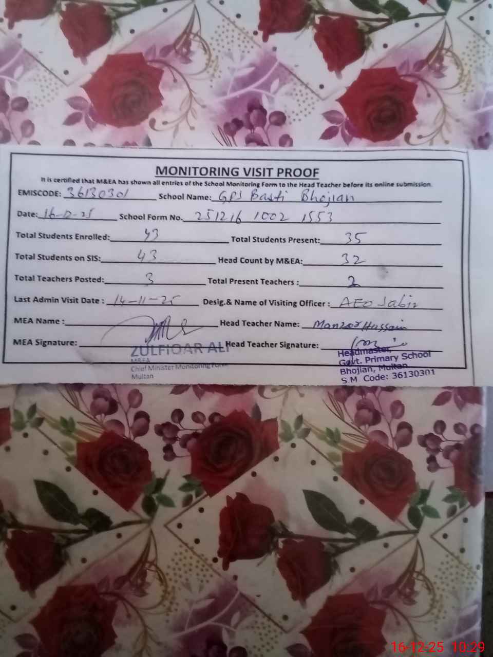 | Certified that this School was Inspected by the Undersigned MEA/DMO Today and the Information Stated Above is as Per Record. | |||||