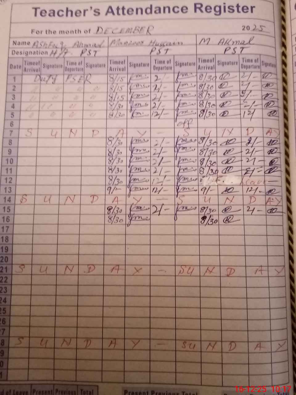 | CNIC | Full Name | Designation | R/C | Absence During Last Calender Month |