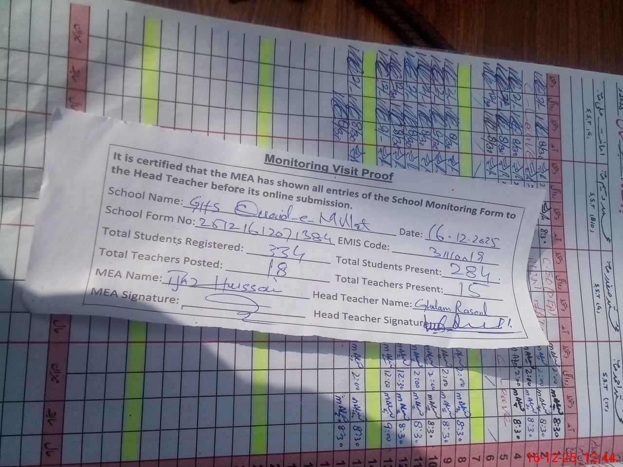 | Attendance Register | Head Teacher | MEA with School | Visit Proof |