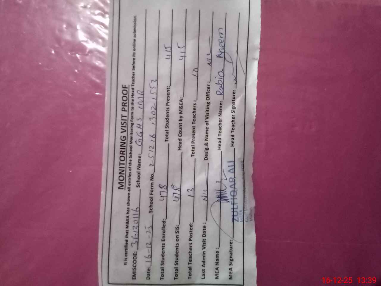| Attendance Register | Head Teacher | MEA with School | Visit Proof |