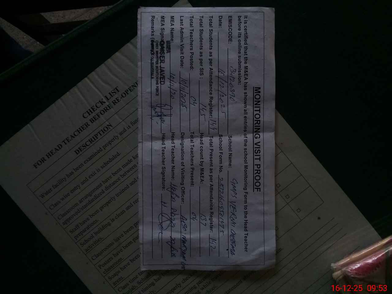 | Attendance Register | Head Teacher | MEA with School | Visit Proof |