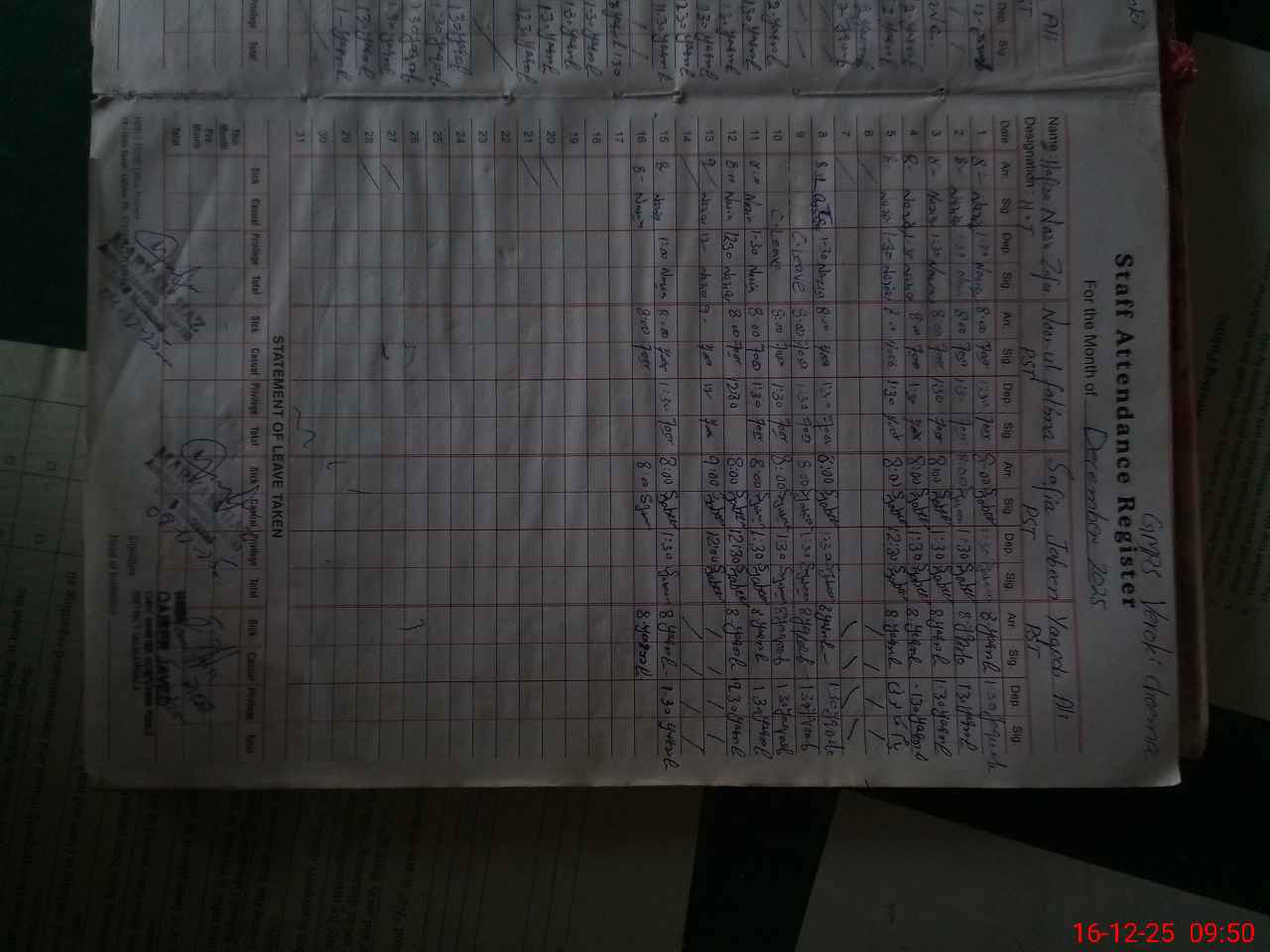 | CNIC | Full Name | Designation | R/C | Absence During Last Calender Month |