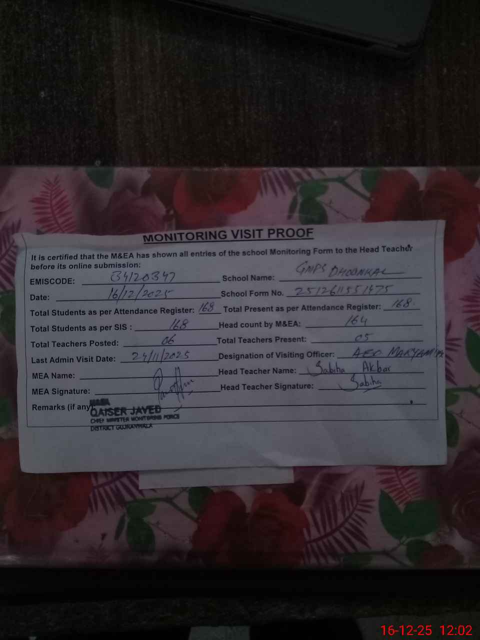 | EMIS Code: 34120347 | Name of School: GMPS DHOUNKAL | |||