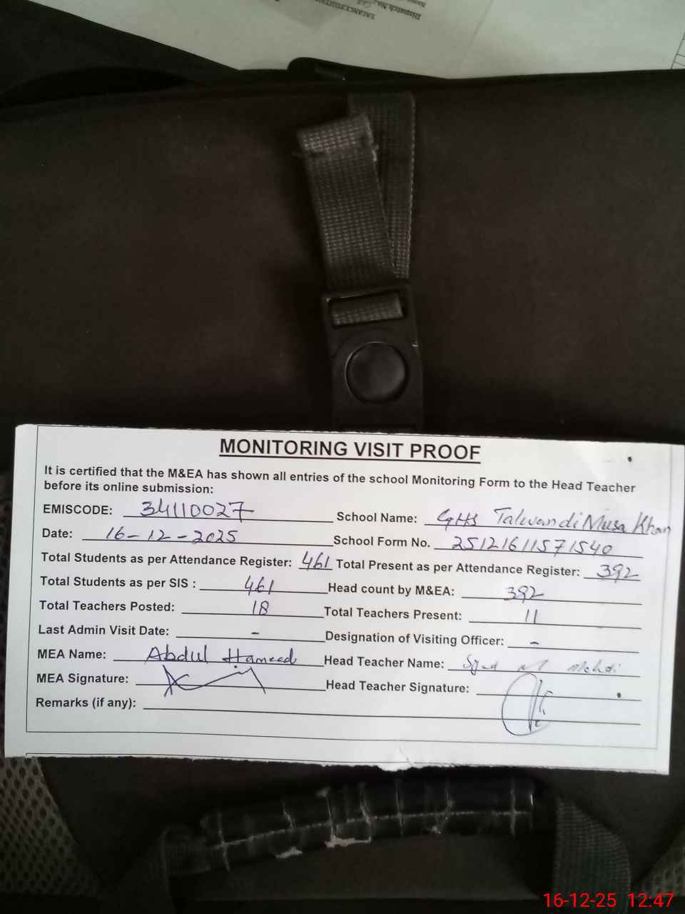 | Attendance Register | Head Teacher | MEA with School | Visit Proof |