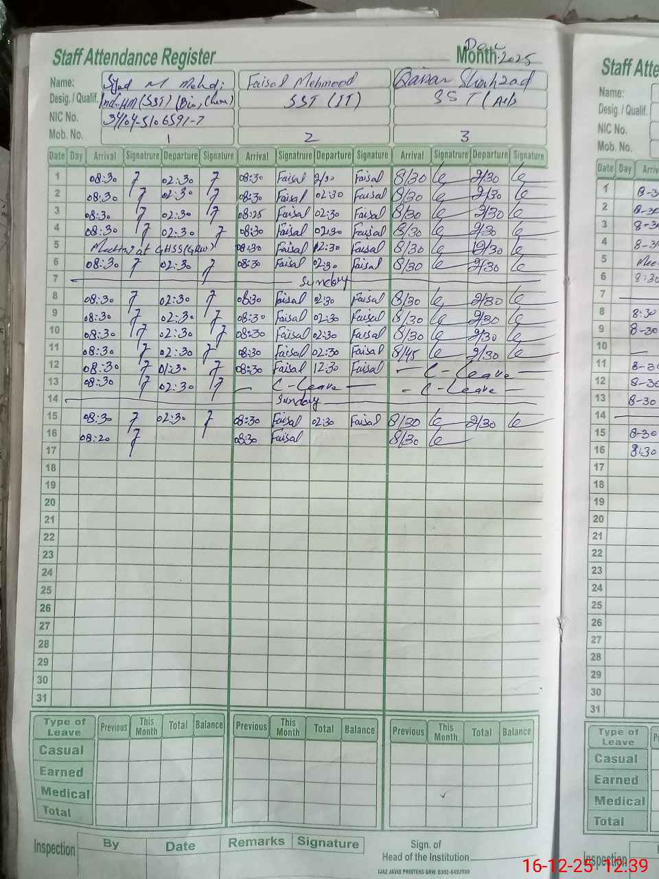 | CNIC | Full Name | Designation | R/C | Absence during last cal. month |