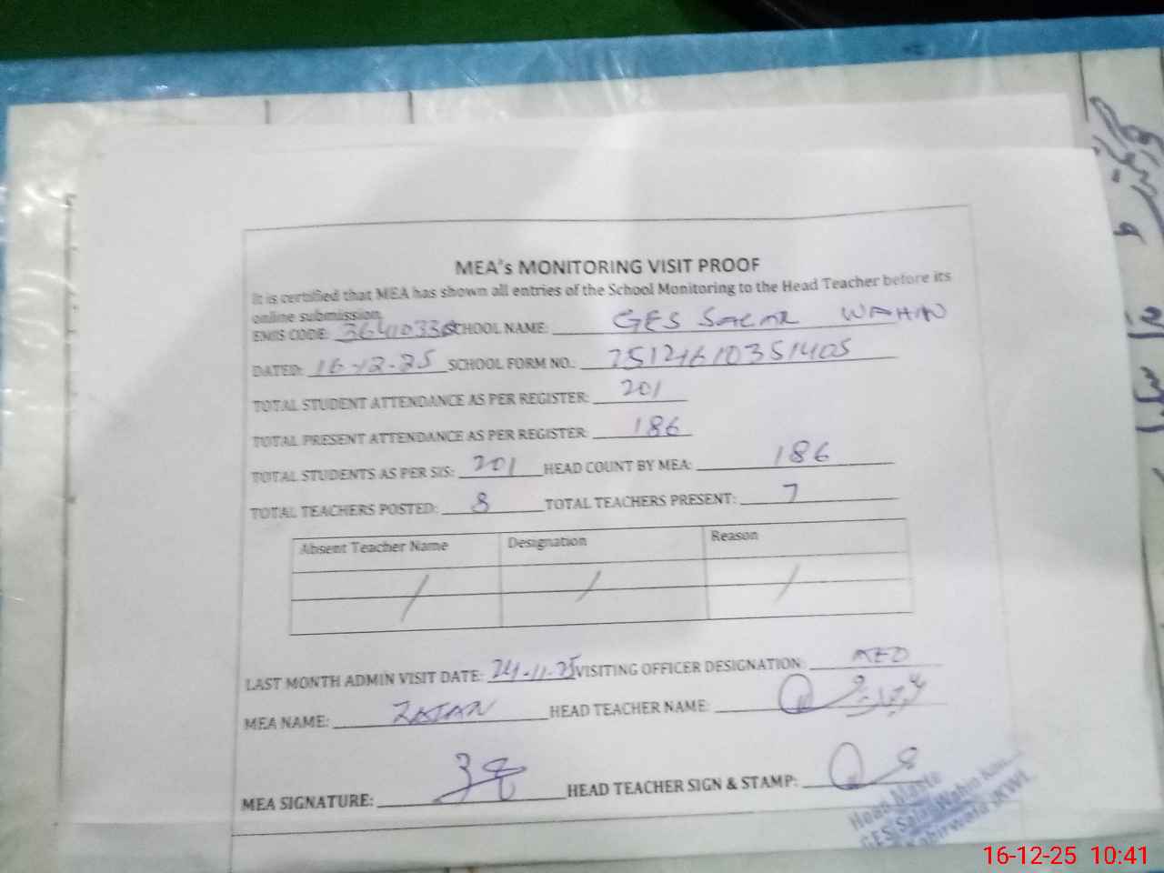 | Attendance Register | Head Teacher | MEA with School | Visit Proof |