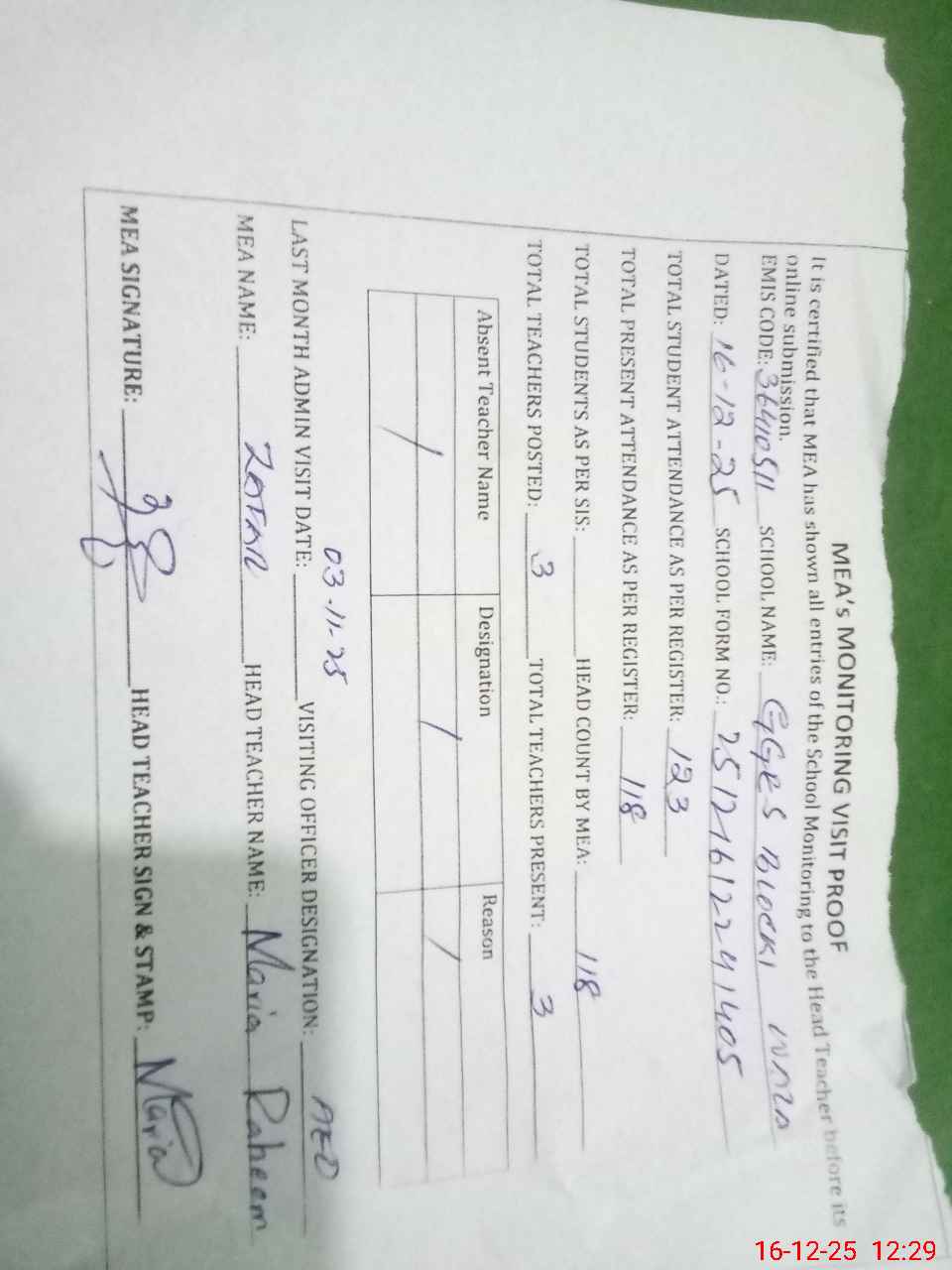 | Attendance Register | Head Teacher | MEA with School | Visit Proof |