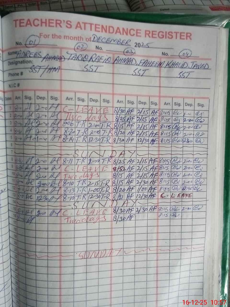 | CNIC | Full Name | Designation | R/C | Absence during last cal. month |
