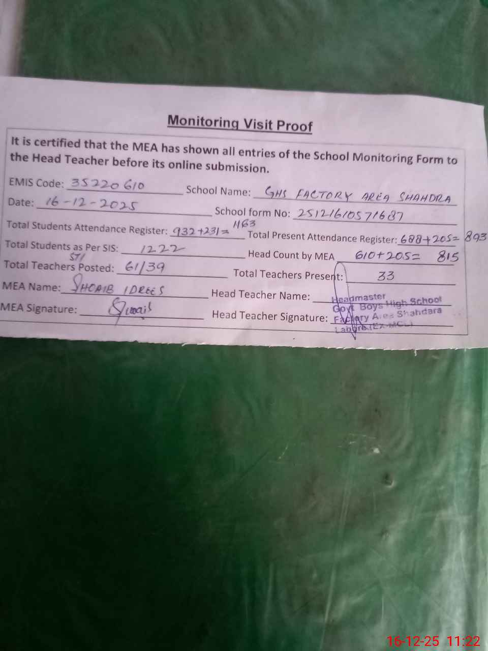 | Attendance Register | Head Teacher | MEA with School | Visit Proof |