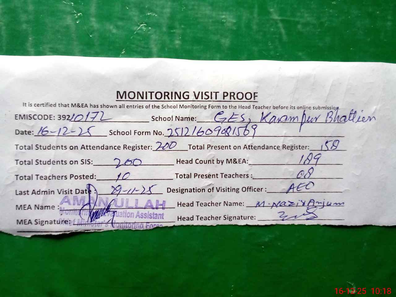 | Attendance Register | Head Teacher | MEA with School | Visit Proof |